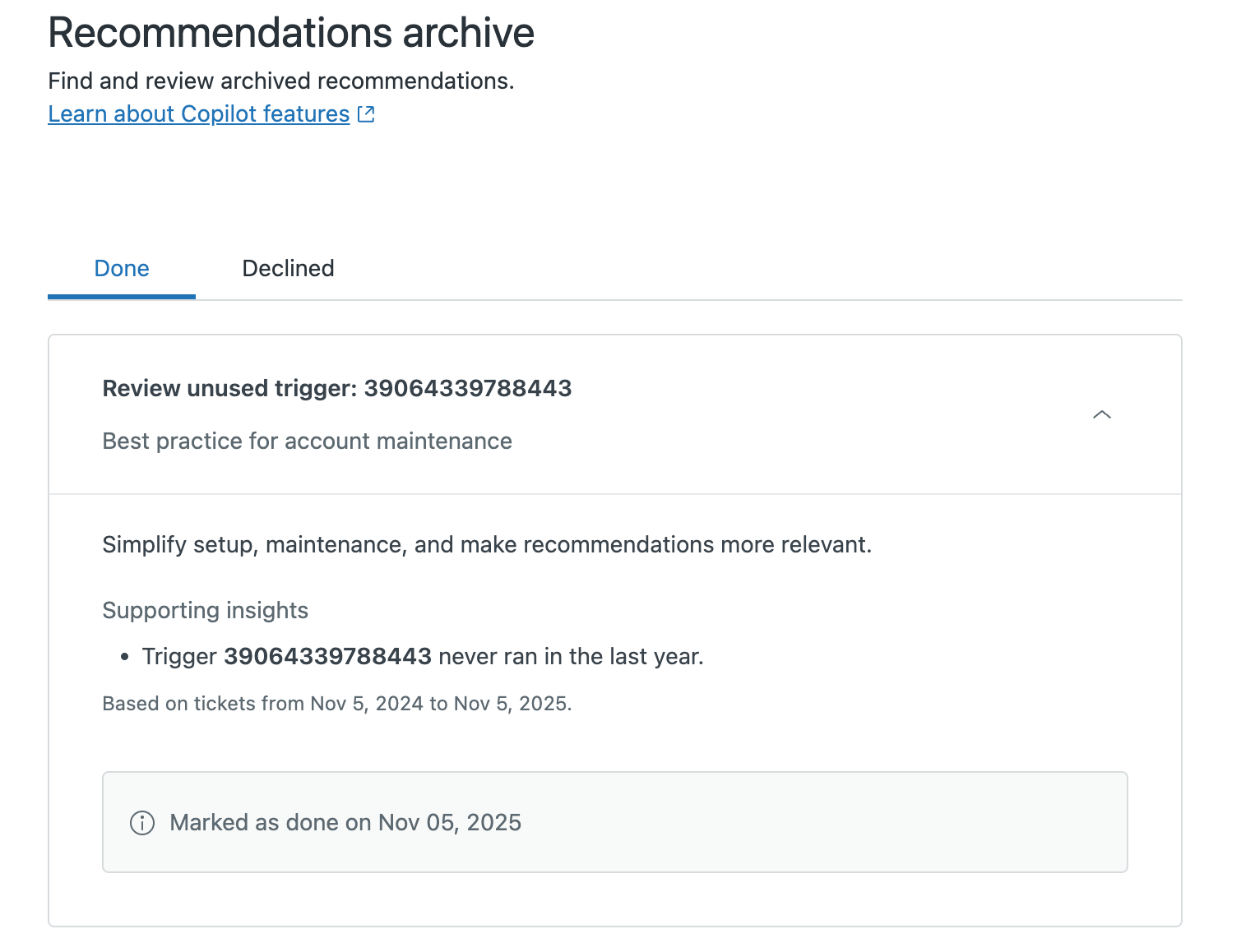 Quando inizi a usare Copilot nel tuo account, in questa pagina viene fornito un elenco di consigli basati AI che viene aggiornato settimanalmente. Questi suggerimenti forniscono indicazioni utili su come automatizzare le attività e ottimizzare i workflow dei ticket creando trigger e risposte automatiche in base allo scopo, sentiment, alla lingua e alle entità rilevate dei ticket. I suggerimenti forniscono anche indicazioni su come migliorare la configurazione assistenza automatica e suggerimenti per la revisione delle regole aziendali e delle macro inutilizzate.