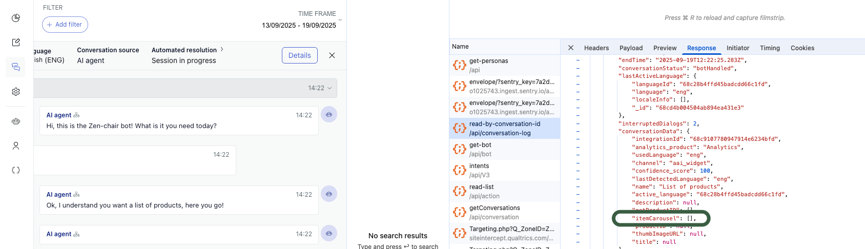 L’ispezione della scheda Rete negli Strumenti per sviluppatori del browser rivela che l’array del carosello viene restituito vuoto: