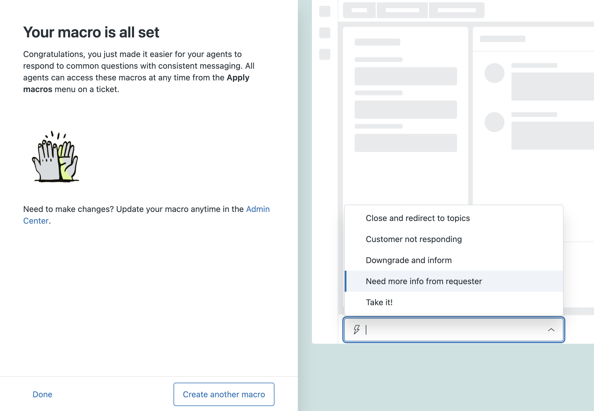 Dopo aver completato le attività di prova di base per Zendesk Suite, avvia la configurazione guidata per le macro. La procedura guidata ti aiuta a impostare alcune macro che puoi usare per rispondere a problemi comuni e risparmiare tempo per gli agenti.