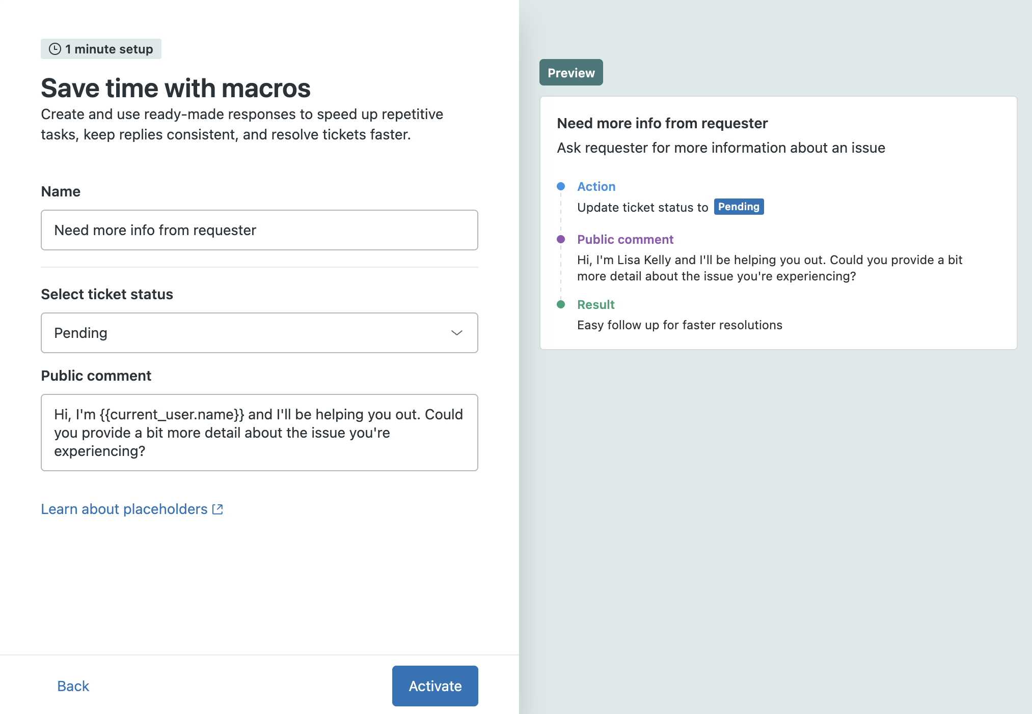 La procedura guidata mostra un elenco di macro che puoi aggiungere per risparmiare tempo agli agenti. Man mano che la procedura guidata, vedrai una descrizione delle azioni eseguite da ciascuna macro e i commenti del ticket aggiunti dalla macro.