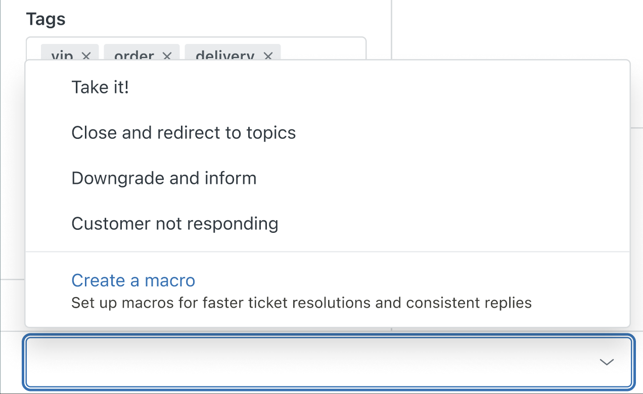 Zendesk offre una procedura guidata di configurazione che puoi usare per creare macro per le richieste assistenza che possono essere risolte con una singola risposta o azione standard. Le macro sono risposte preconfigurate che consentono agli agenti di risparmiare tempo e fatica nel rispondere manualmente a più clienti con lo stesso problema. Per ulteriori informazioni, consulta Creazione di macro per risposte e azioni ripetitive ai ticket.