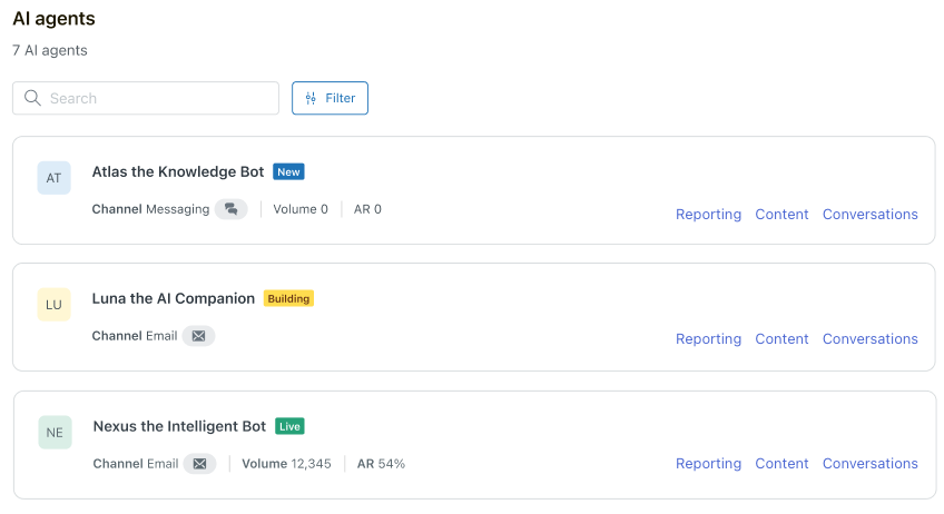 Puoi cercare un agenti AI specifico o filtrare l’elenco in base al canale o allo stato.