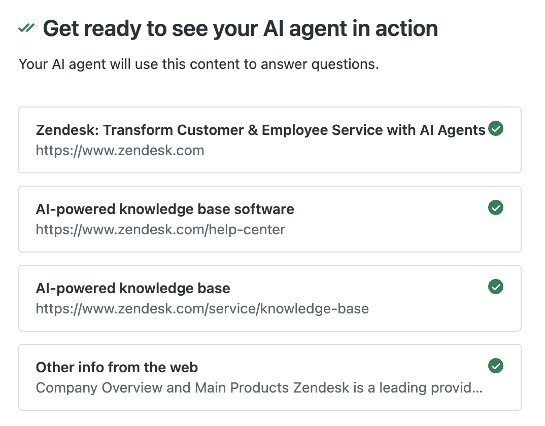Zendesk usa le informazioni sul tuo sito web per creare conoscenze per il tuo agenti AI. Questo aiuta l’ agenti AI a rispondere alle domande dei clienti.