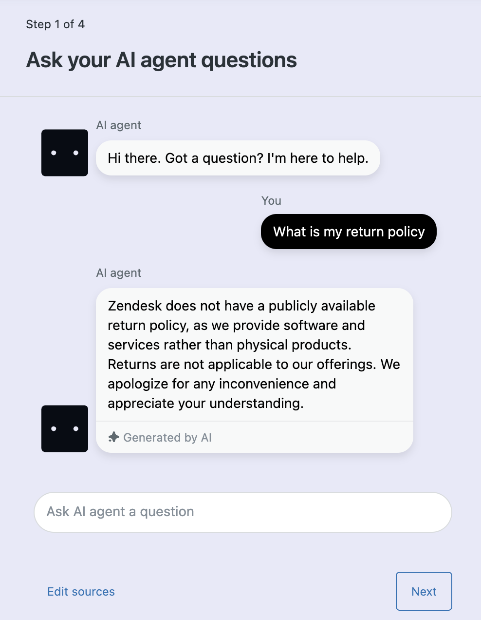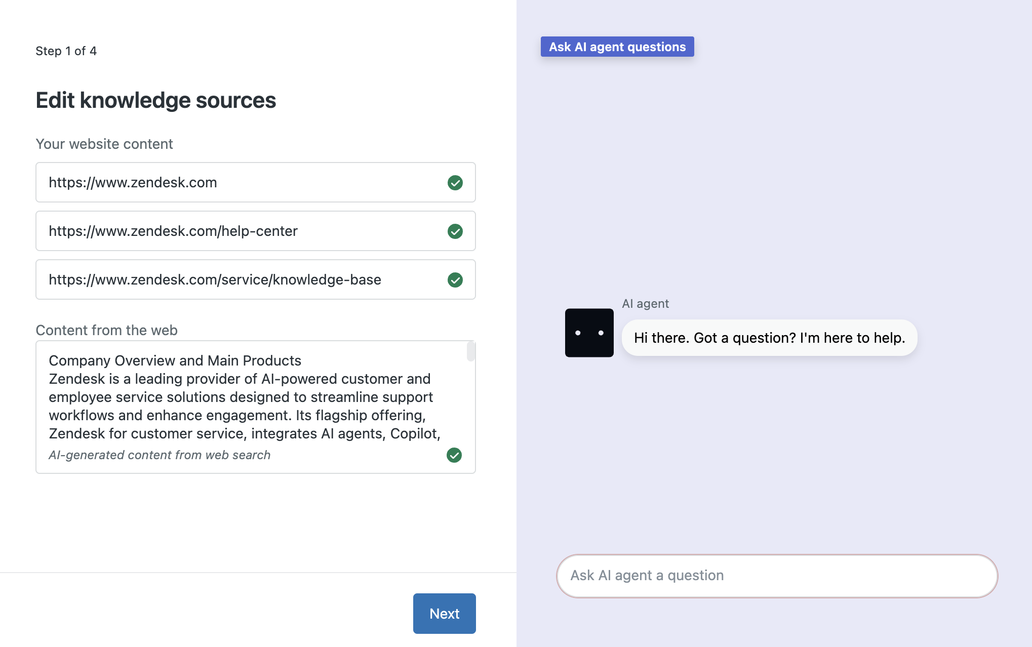 - Quando hai finito di provare alcune domande, fai clic su Avanti per continuare la configurazione agenti AI .