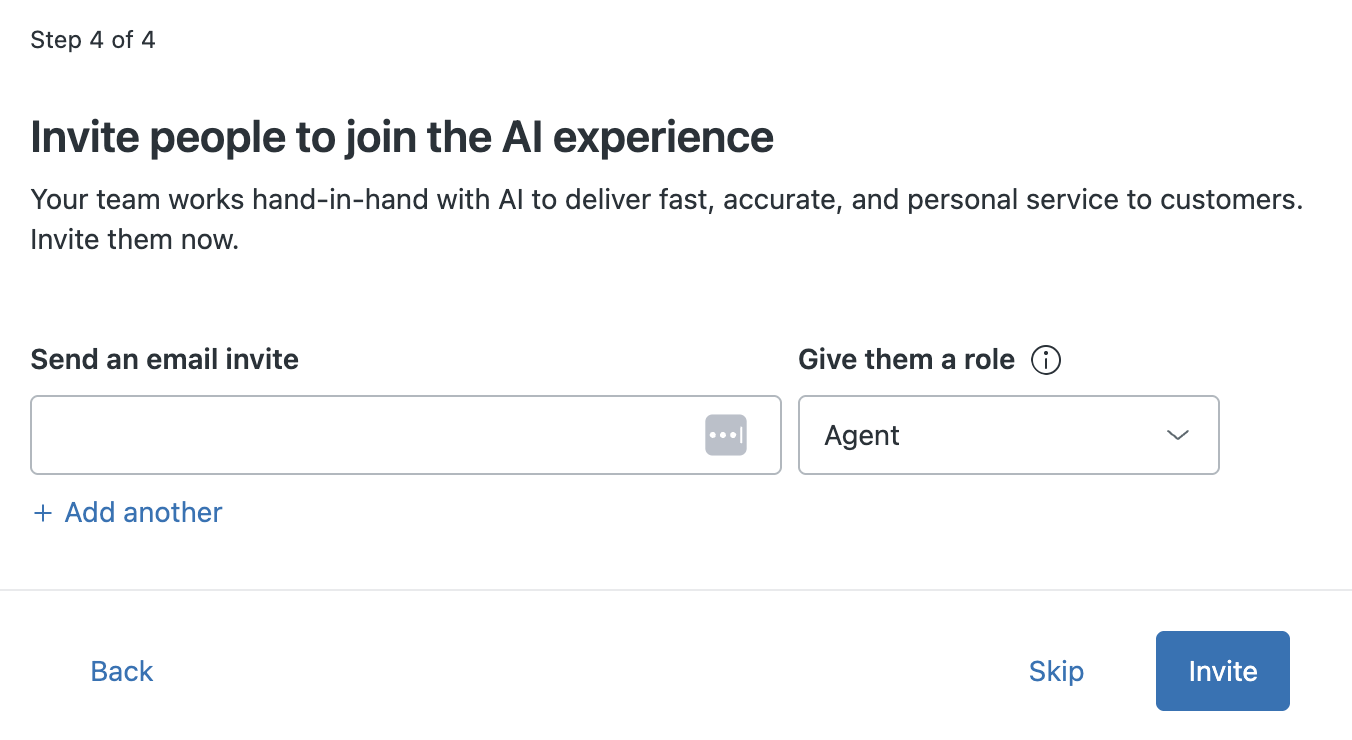 L’invito di altri membri del team consente loro di accedere al periodo di prova Zendesk Suite e di provare un agenti AI. I membri del team agiscono come agenti e amministratori per aiutarti a gestire le richieste assistenza . Puoi aggiungere fino a quattro membri del team aggiuntivi al tuo account di prova. Per ulteriori informazioni sui membri del team, consulta Aggiunta di agenti e amministratori.