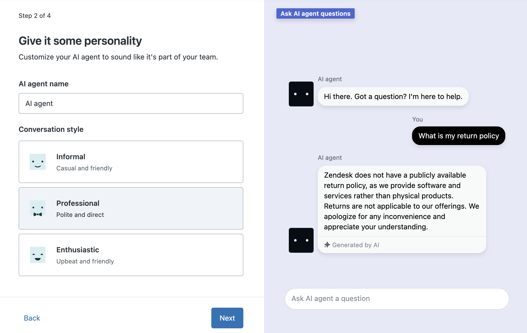 Puoi controllare il modo in cui gli agenti AI rispondono ai clienti agenti AI un nome e scegliendo uno stile di conversazione. Questi elementi definiscono il modo in cui vuoi entrare in contatto con i clienti. Per maggiori informazioni, consulta Configurazione di una personalità agenti AI.