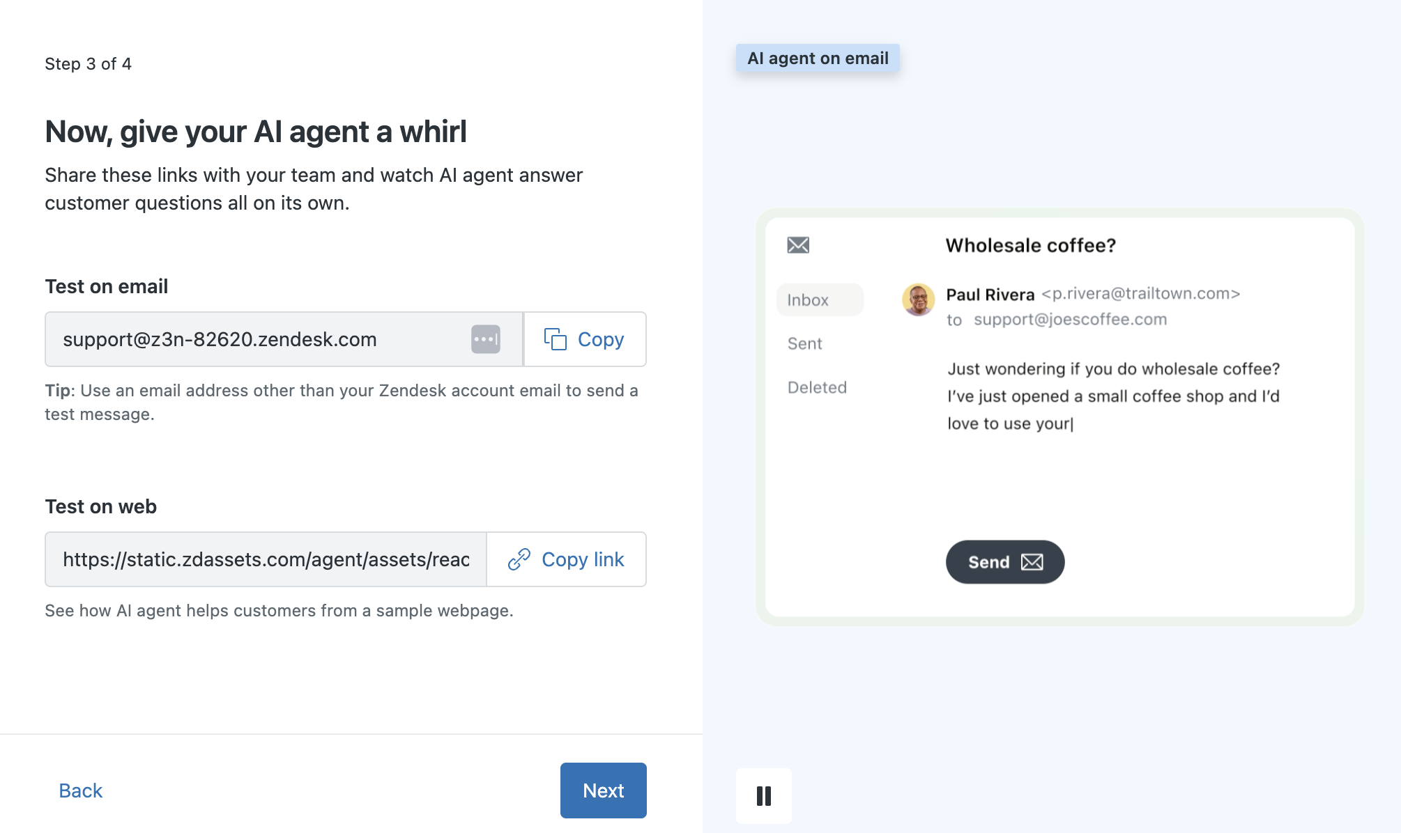 Ora che l’ agenti AI ha una certa conoscenza e una personalità, puoi provarlo inviando una domanda via email o digitando in un widget di chat. Puoi provare diverse varianti della domanda nelle email e nelle chat per vedere come funziona. Per maggiori informazioni, consulta Test di un agenti AI.