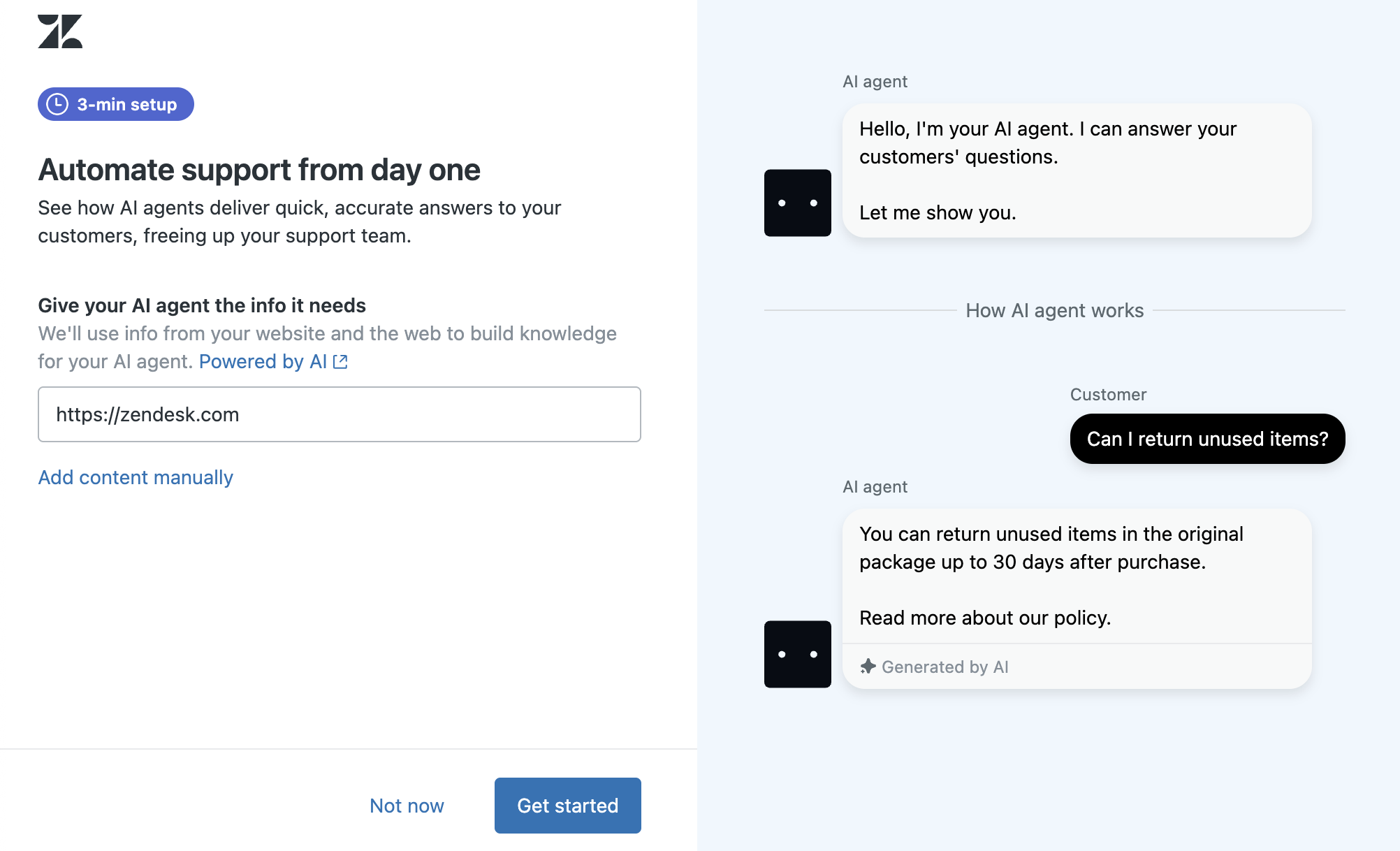 Il lato sinistro della procedura guidata include un campo di testo in cui puoi aggiungere il tuo sito web. Il simulatore sul lato destro della procedura guidata mostra come l’ agenti AI lavora con i clienti quando fanno domande. Per ulteriori informazioni sul funzionamento degli agenti AI di Zendesk, fai clic su Basato AI.
