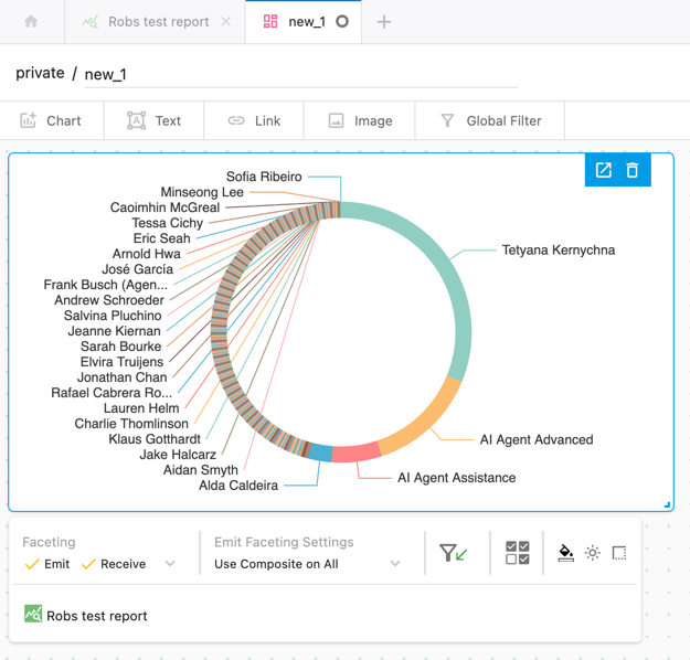 Dopo aver creato un dashboard, Analyst Copilot include strumenti che puoi usare per mostrare solo i risultati desiderati. Questi strumenti includono faceting e filtri globali.