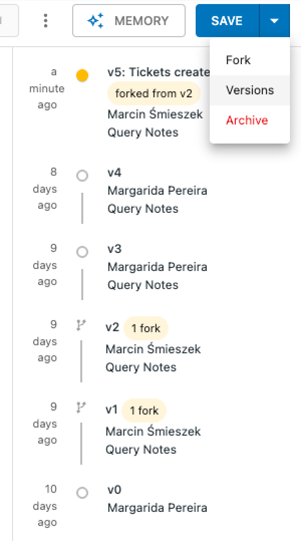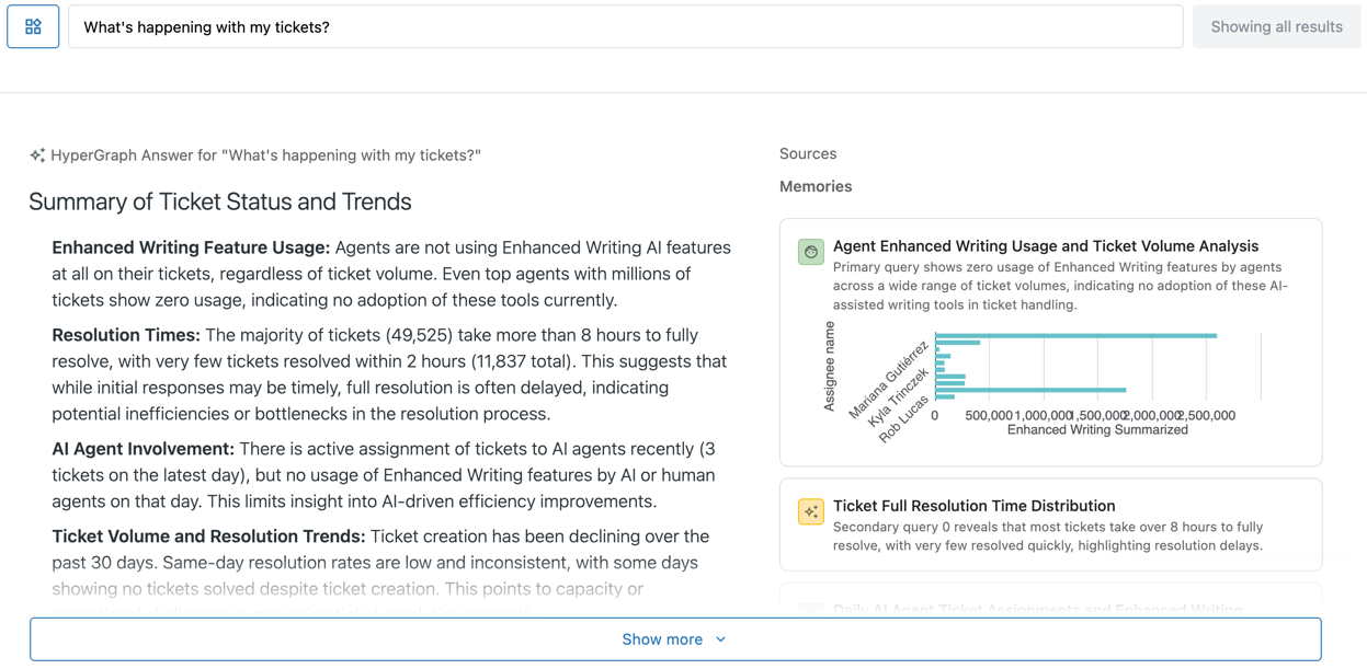 - HyperGraph: Una mappa visiva dei ricordi delle query. Ogni nodo in un HyperGraph è un passaggio distinto (come una query, una metrica o un filtro) e i link mostrano la relazione tra questi passaggi. Questo ti dà la possibilità di controllare e riutilizzare i passaggi e di porre domande basate sui passaggi esatti che hanno prodotto i risultati.