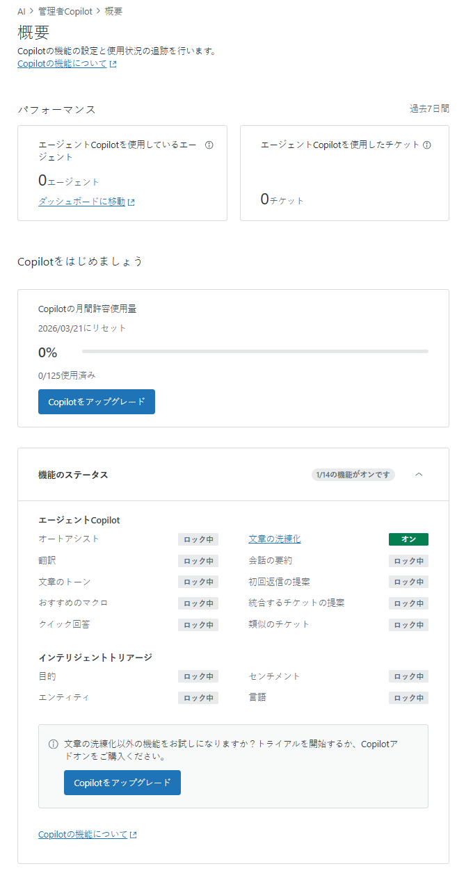 CopilotのAI文章作成ツールには、チケットのコメントを長文または簡潔にしたり、コメントのトーンを調整したりできるなどの優れた機能があります。各エージェントの利用回数は月5回に制限されており、チーム全体で共有が可能です。管理センターで利用状況を確認し、頻繁に上限に達する場合は、無制限の利用と追加機能を利用できる完全版のCopilotアドオンへのアップグレードをご検討ください。