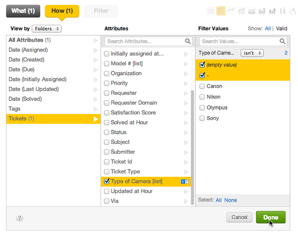 メモ:これら2つの属性はこのレポートで意味のあるデータを含まないため、削除することをお勧めします。ハイフン(-)はカスタムフィールドに何も選択されなかったことを意味し、「empty value」はこのカスタムフィールドが作成されたときにはチケットが既に終了していたことを意味します。 - 操作が終わったら、「Done」をクリックします。