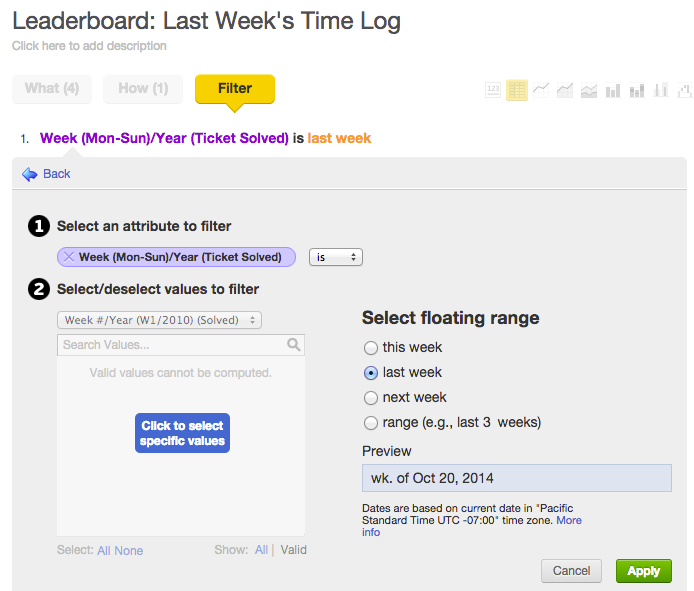 先週のチケットサポート時間だけを調べたい場合、「Filter」をクリックして、「Week (Mon-Sun)/Year (Event)」、「is」、「Last Week」と設定し、新しいフィルターを追加。