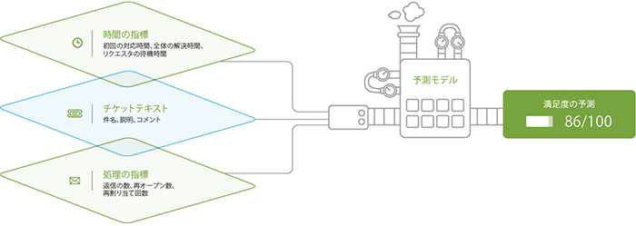 満足度予測スコアは、チケットが満足度評価で「満足」と「不満」のどちらの評価を受けそうかを示す指標です。アカウントの予測モデルは、過去のカスタマーサポートデータおよび満足度評価データを使用して構築されます。新しいチケットおよびチケットの更新は、やり取りが終わった時点でカスタマーが満足しそうかどうかを見極めるために、このモデルに照らして評価されます。
