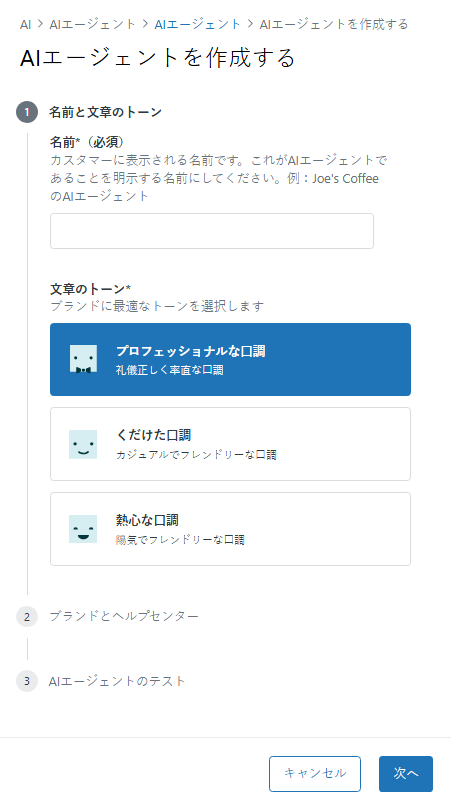 AI」をクリックし、「AIエージェント」>「AIエージェント」を選択します。 - 「AIエージェントを作成」をクリックします。
