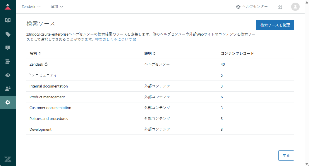 横串検索やコネクタの設定時に定義した各外部ソースの名前が、ヘルプセンターや関連付けられたコミュニティ(複数のブランドのヘルプセンターを作成した場合)とともにリストに表示されます。