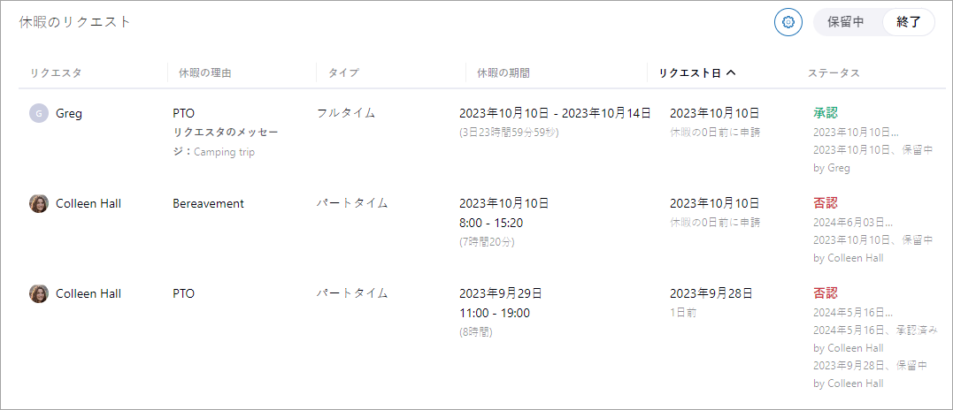 - チームまたは特定のエージェントの承認または否認された休暇リクエストを表示するには、トグルを「保留中」から「終了」に切り替えます。
