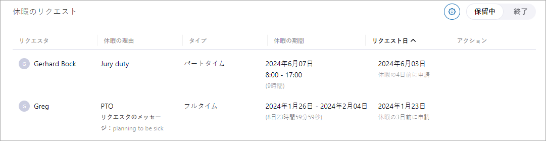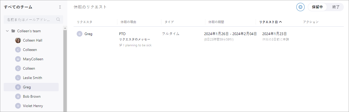 デフォルトでは、保留中の休暇リクエストが表示されます。