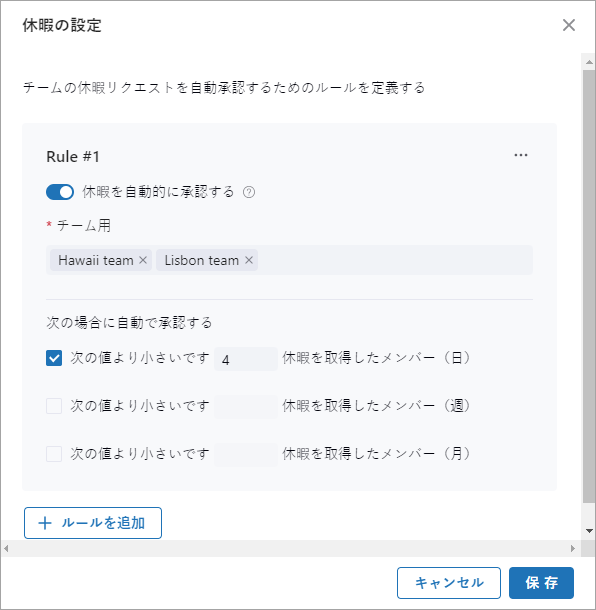 - 「休暇設定」ダイアログで、「+ルールを追加」をクリックします。