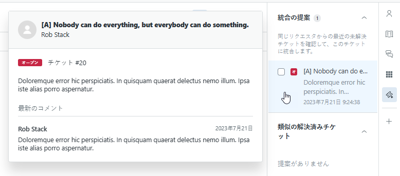 統合の候補により、現在エージェントが作業中のチケットと統合可能なチケットが特定されます。これらの候補は、チケット内のコンテキストパネルに表示されます。