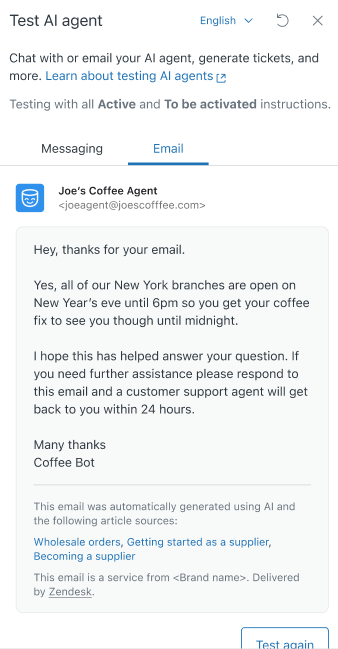 メールまたはWebフォームチャネルのAIエージェントの動作をテストするには、「AIエージェントをテスト」ボタンを使用できます。