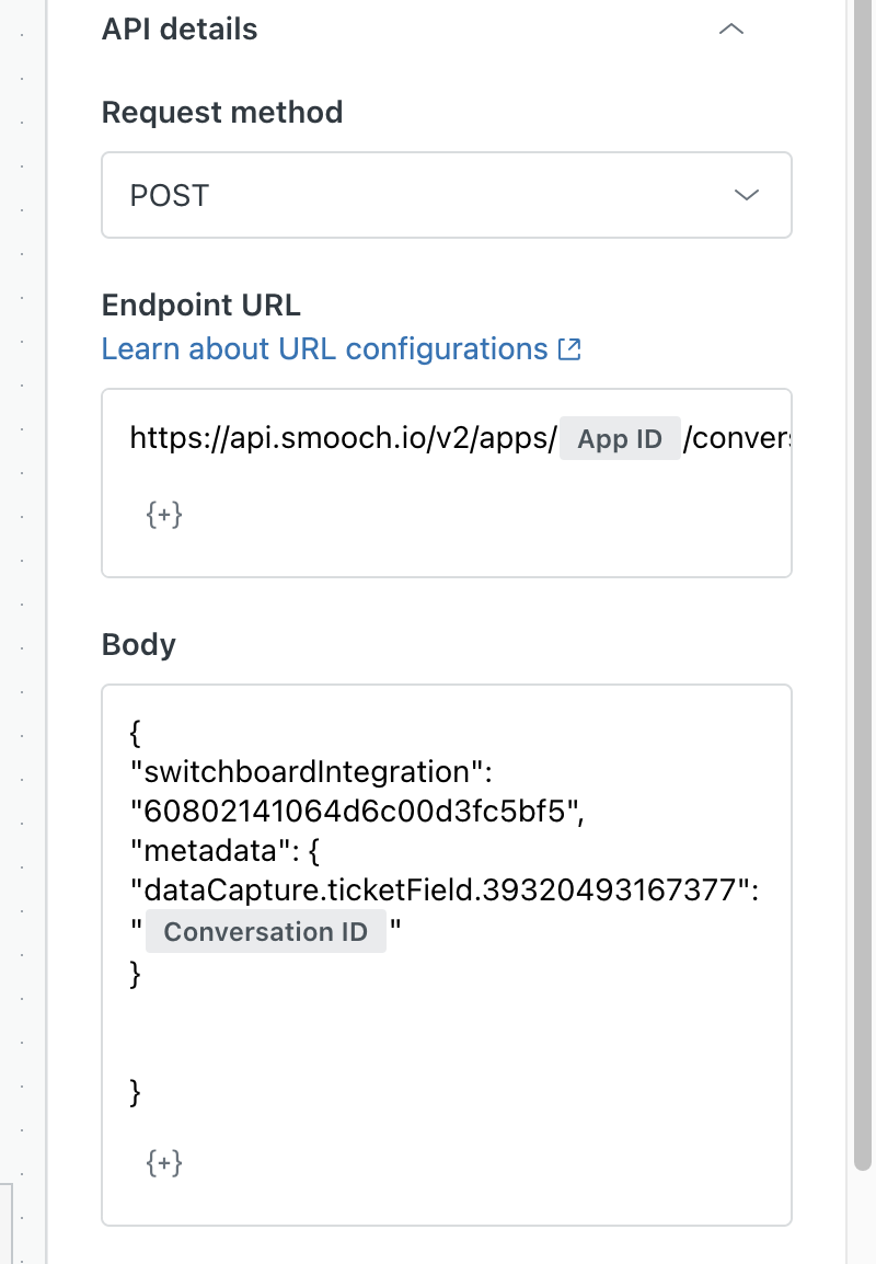 ZendeskアカウントのスイッチボードIDを見つけ、body JSONフィールドのswitchboardIntegration値を置き換えます。さらにサポートが必要な場合は、Zendeskカスタマーサポートにお問い合わせください。