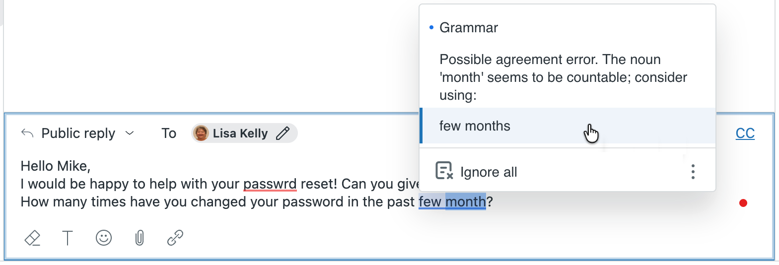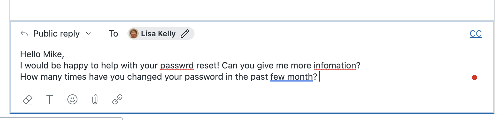 티켓 작성기에서 응답을 작성할 때 맞춤법 및 문법 검사기가 자동으로 잠재적 오류에 플래그를 지정합니다. 맞춤법 오류는 빨간색 밑줄로, 문법 오류는 파란색 밑줄로 표시됩니다.