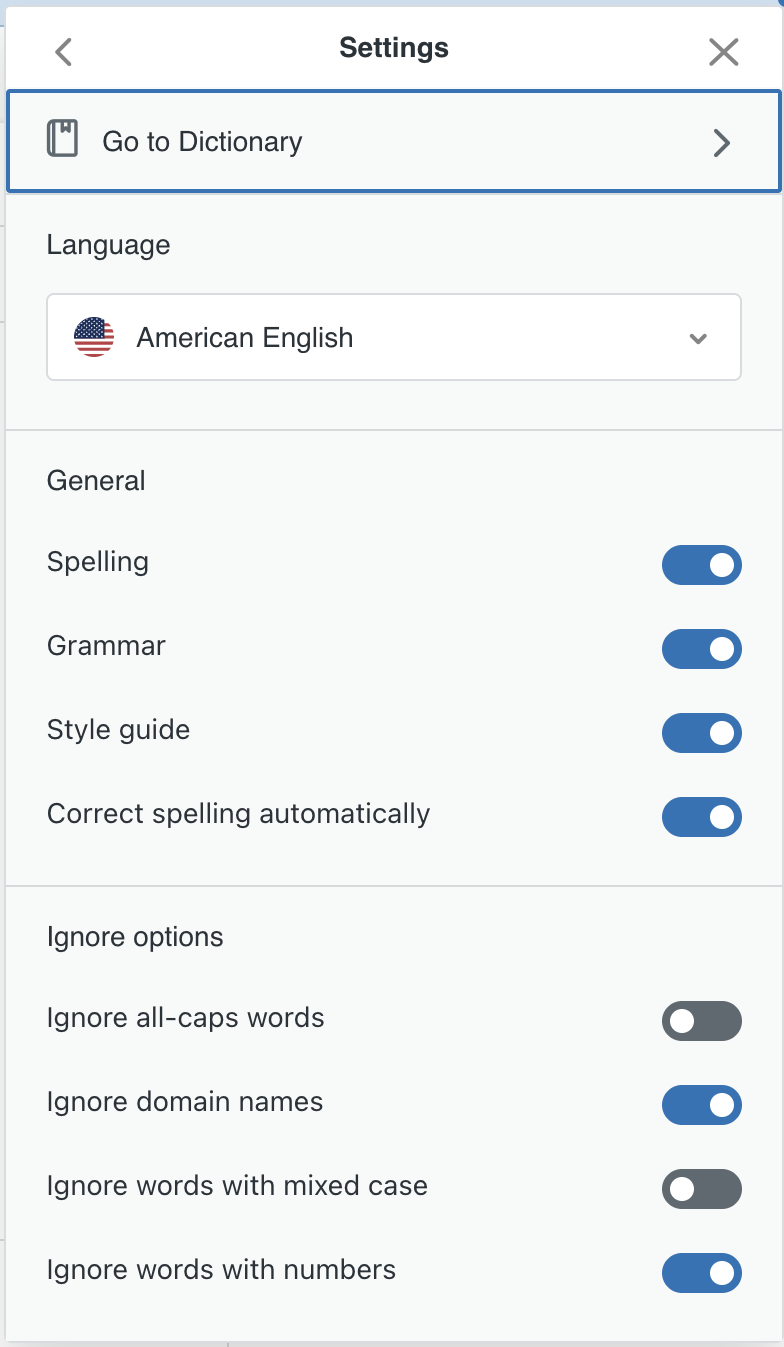 맞춤법 및 문법 검사기의 설정을 조정하여 맞춤화할 수 있습니다. 설정에는 다음과 같은 옵션이 포함됩니다.