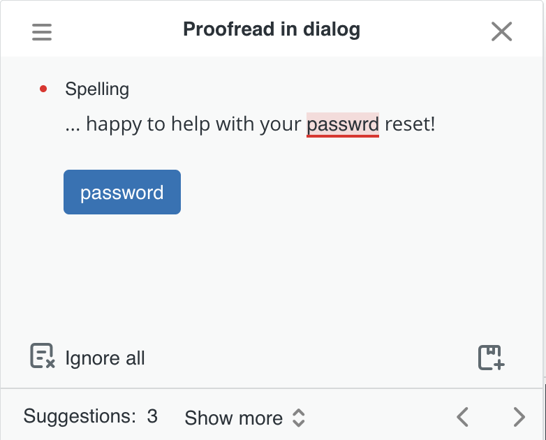 잠재적인 오류에 플래그를 지정하고 추천을 제공하는 맞춤법 및 문법 검사기를 사용하여 티켓 답장을 개선하세요. 사전을 사용자 지정하고, 더 효율적인 편집을 위해 한 번에 여러 오류를 교정하고, 언어 기본 설정 및 자동 수정을 포함하여 필요에 맞게 설정을 조정하세요.