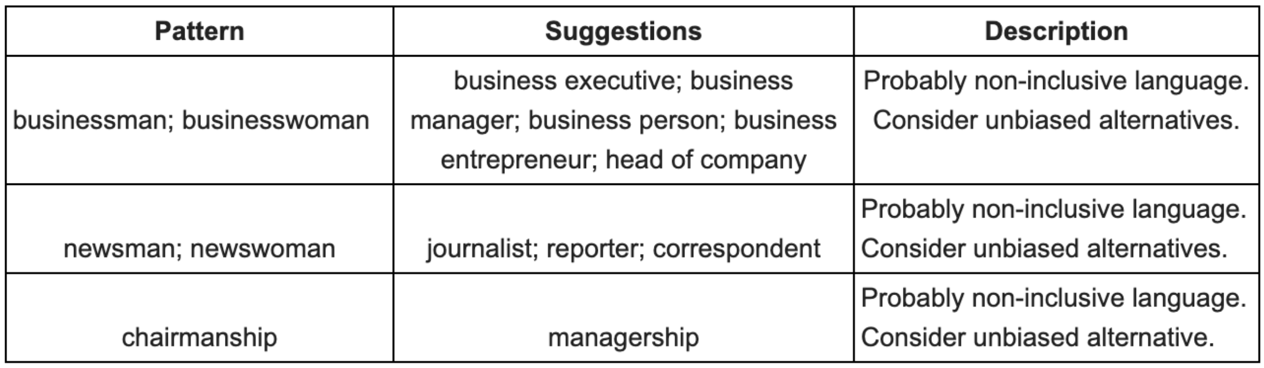 스타일 가이드는 포괄적이지 않은 문구 및 욕설 등 부적절한 언어로 문제에 플래그를 지정합니다. 예: