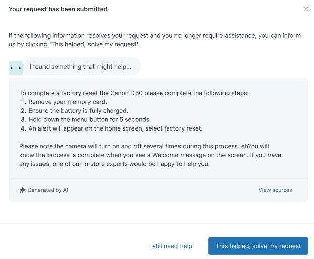 이 업데이트를 통해 요청자가 웹 양식에서 제출을 클릭하면 AI 상담사 응답을 바로 표시하는 대화 상자가 표시됩니다. 이로써 요청자가 이메일로 전환하지 않고도 브라우저에서 바로 답변을 얻을 수 있습니다. 예: