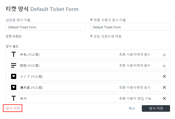 )을 클릭합니다. - 티켓 양식 아래쪽에 있는 양식 삭제를 클릭합니다.