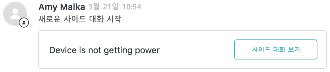 사이드 대화는 상담원이 티켓 내에서 특정 그룹의 사람들과 사이드 대화를 나누거나 우려 부분 또는 행동 방침에 대해 논의하는 공간입니다. 사이드 대화를 사용해서 티켓에 대한 정보를 체계적으로 정리할 수 있습니다.