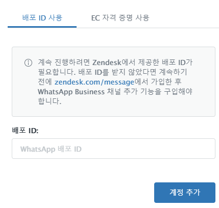 배포 ID를 사용하여 WhatsApp 계정을 Zendesk Support에 연결하려면 다음과 같이 하세요.
