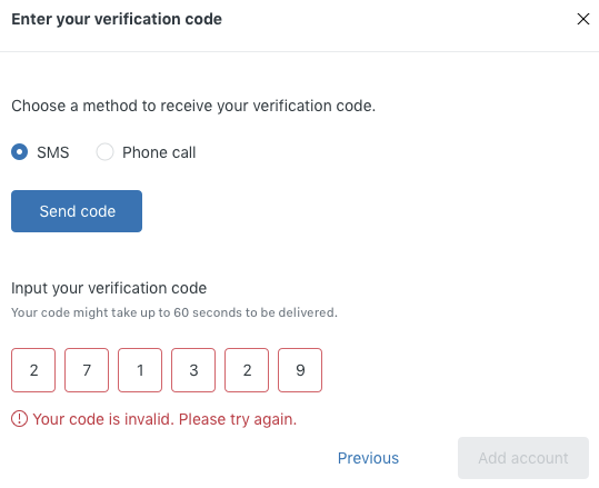 - 인증 방법(SMS 또는 전화 통화)을 선택한 다음 코드 보내기를 클릭합니다.