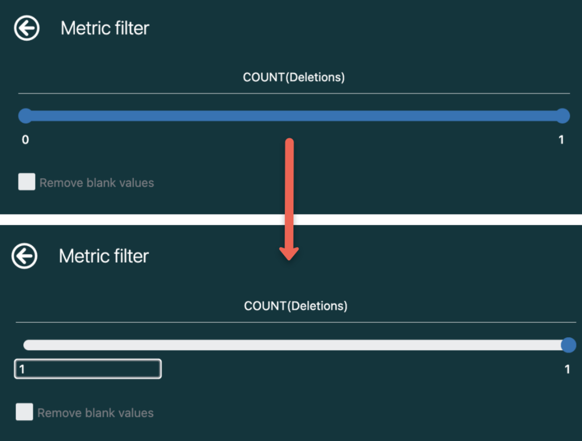 메트릭 필터를 클릭합니다. 하한을 1로 변경합니다.. 이렇게 하면 보고서에서 부적격 티켓이 제거됩니다.