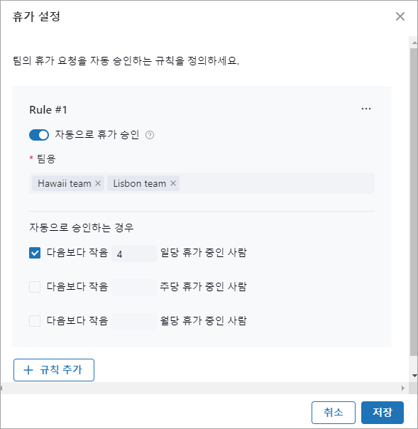 - 휴가 설정 대화 상자에서 +규칙 추가를 클릭합니다.