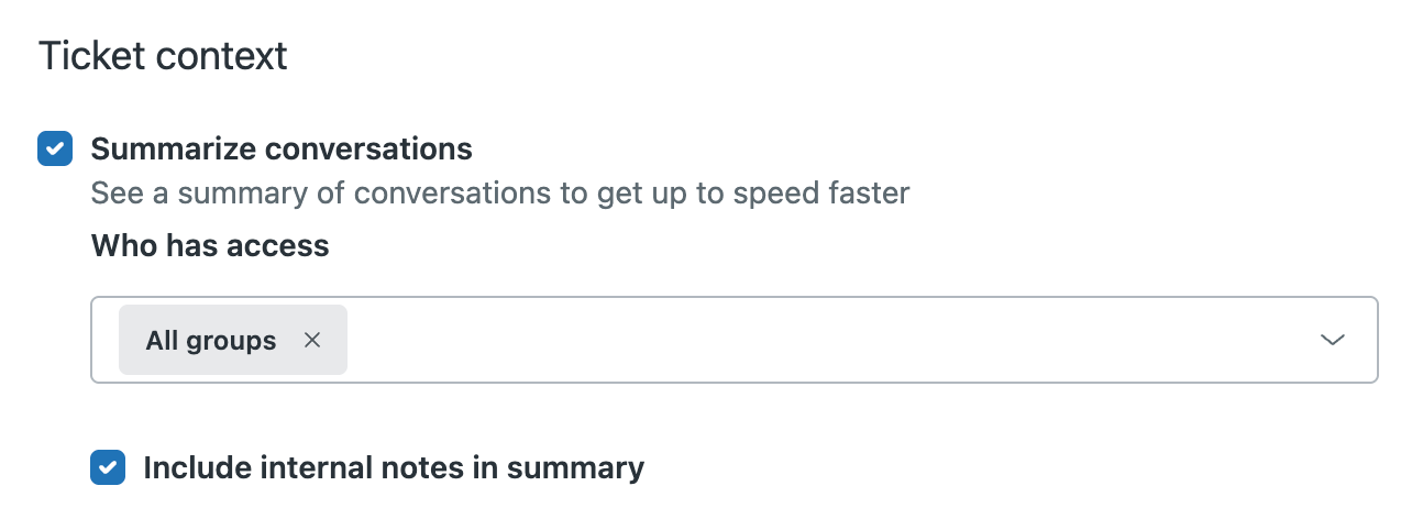 AI 생성한 티켓 요약은 공개 댓글과 내부 메모(선택 사항)에 대한 간략한 요약을 제공하여 상담사가 더 빨리 응답할 수 있도록 돕습니다. 이 기능을 설정 또는 해제하고 어느 그룹이 이 기능에 액세스할 수 있는지 선택할 수 있습니다. 내부 메모를 포함하면 문제 해결 단계 및 에스컬레이션 업데이트와 같은 중요한 세부 정보로 요약이 향상됩니다. 요약은 티켓 필드에 저장되며 보고서, 보기 및 API에서 사용될 수 있습니다.