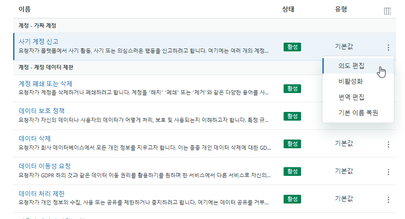기본 의도, 추천 의도, 이름과 설명을 편집하여 만든 모든 사용자 지정 의도를 편집하고 관리할 수 있습니다. 필요에 따라 의도를 비활성화하거나 활성화할 수도 있습니다.