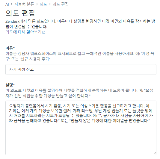 지능형 분류는 편집된 후에도 원래 의도에 따라 계속해서 티켓을 감지합니다. 따라서 의도의 의미를 완전히 바꾸는 업데이트가 아니라 의도의 용어를 약간 조정하기 위해 의도 이름만 편집해야 합니다.