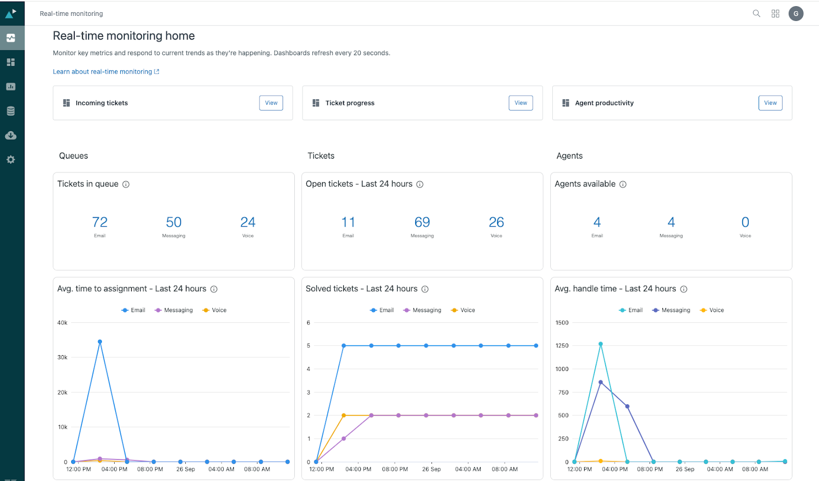 새로운 실시간 모니터링 공간에서는 지원, 메시징 및 음성 채널의 데이터를 결합하여 서비스 운영을 지속적으로 파악합니다.