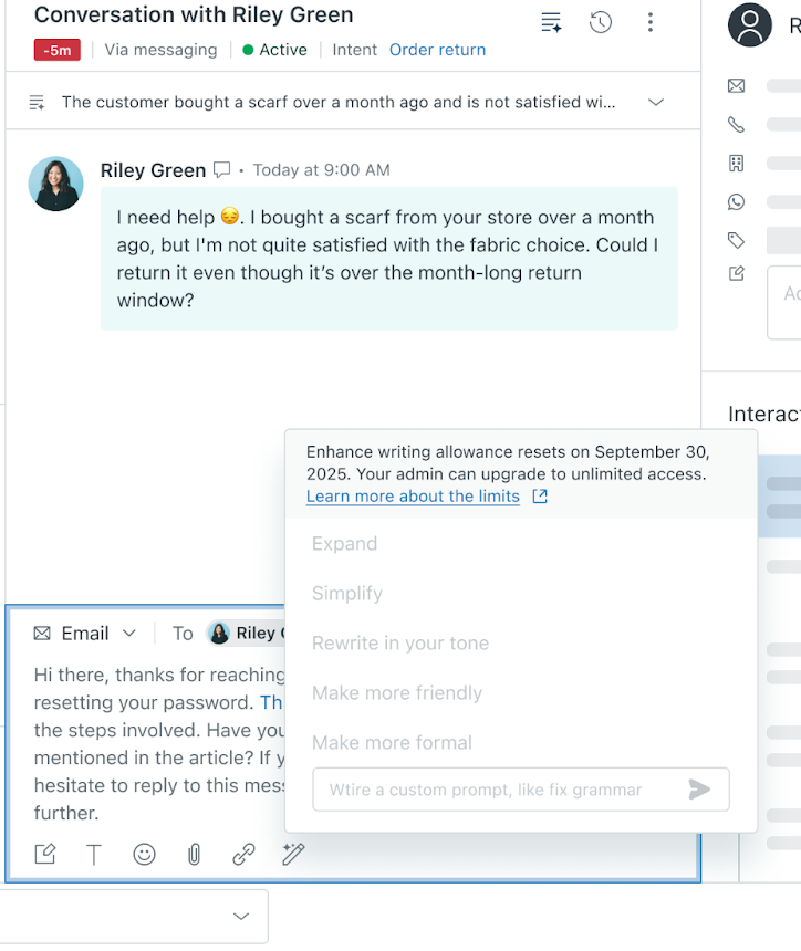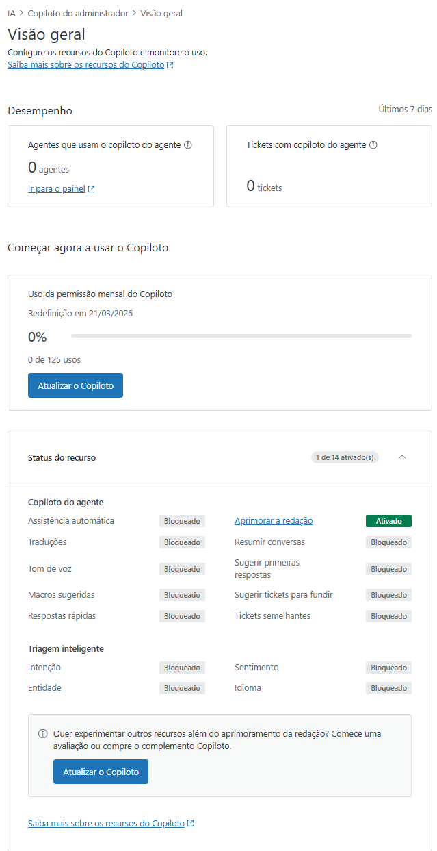 Explore os benefícios das ferramentas de redação com IA do Copiloto, que aprimoram comentários do ticket expandindo, simplificando ou ajustando o tom. Você tem um limite mensal de cinco utilizações por agente, que são agrupadas em sua equipe. Monitore o uso na Central de administração e considere a possibilidade de atualizar para o complemento Copiloto integral para obter acesso ilimitado e recursos adicionais se você atinge o limite com frequência.
