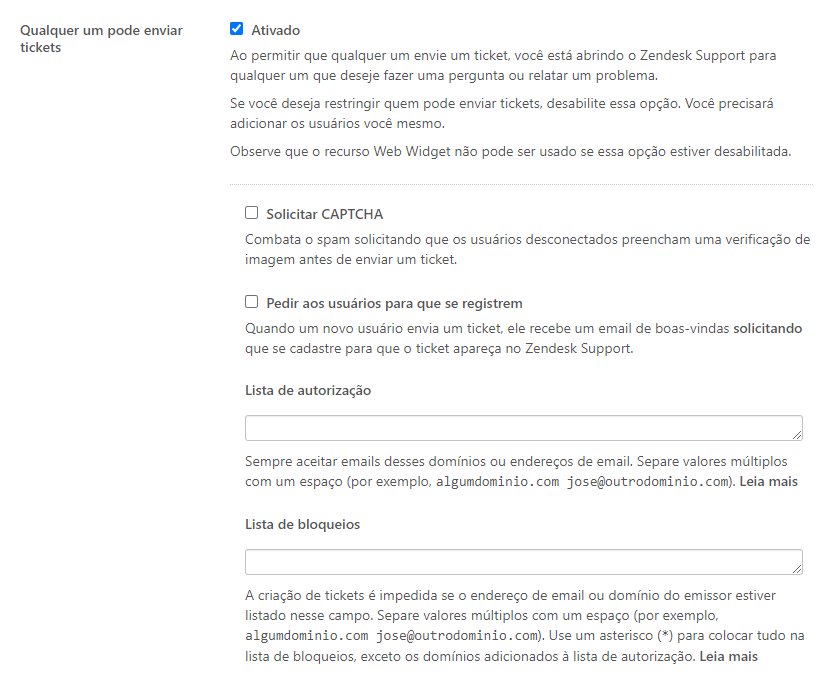 - Para permitir que todos os usuários enviem tickets para o seu Zendesk, exceto os presentes na lista de rejeição, deixe a lista de aceitação vazia.