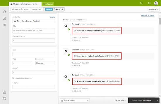 Sempre que você age em um ticket, o score de previsão é recalculado. Isto facilita o entendimento do impacto causado pela atualização do ticket. O score atualizado é anexado a cada evento de ticket de modo que é possível visualizar o histórico do score ao logo da vida do ticket.