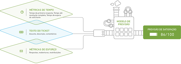 O Score de previsão de satisfação indica a probabilidade de um ticket receber uma classificação de satisfação boa ou ruim. Será criado um modelo preditivo para sua conta usando dados antigos de suporte ao cliente e classificações de satisfação. Os novos tickets e as atualizações dos tickets são avaliados em relação a este modelo para determinar a probabilidade de um cliente ficar satisfeito ao final da interação.