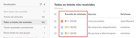 É possível ordenar os tickets na visualização por Score de previsão de satisfação clicando no cabeçalho da coluna.