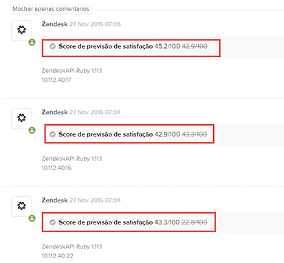 Além disso, ao longo da conversa, é possível ver como o score mudou a cada evento do ticket: