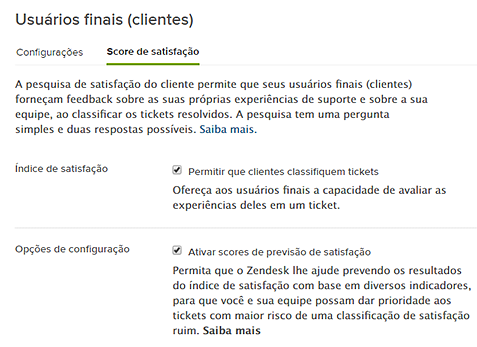 Quando forem recebidos índices de satisfação em quantidade suficiente, os administradores poderão ativar a previsão de satisfação na aba Satisfação.