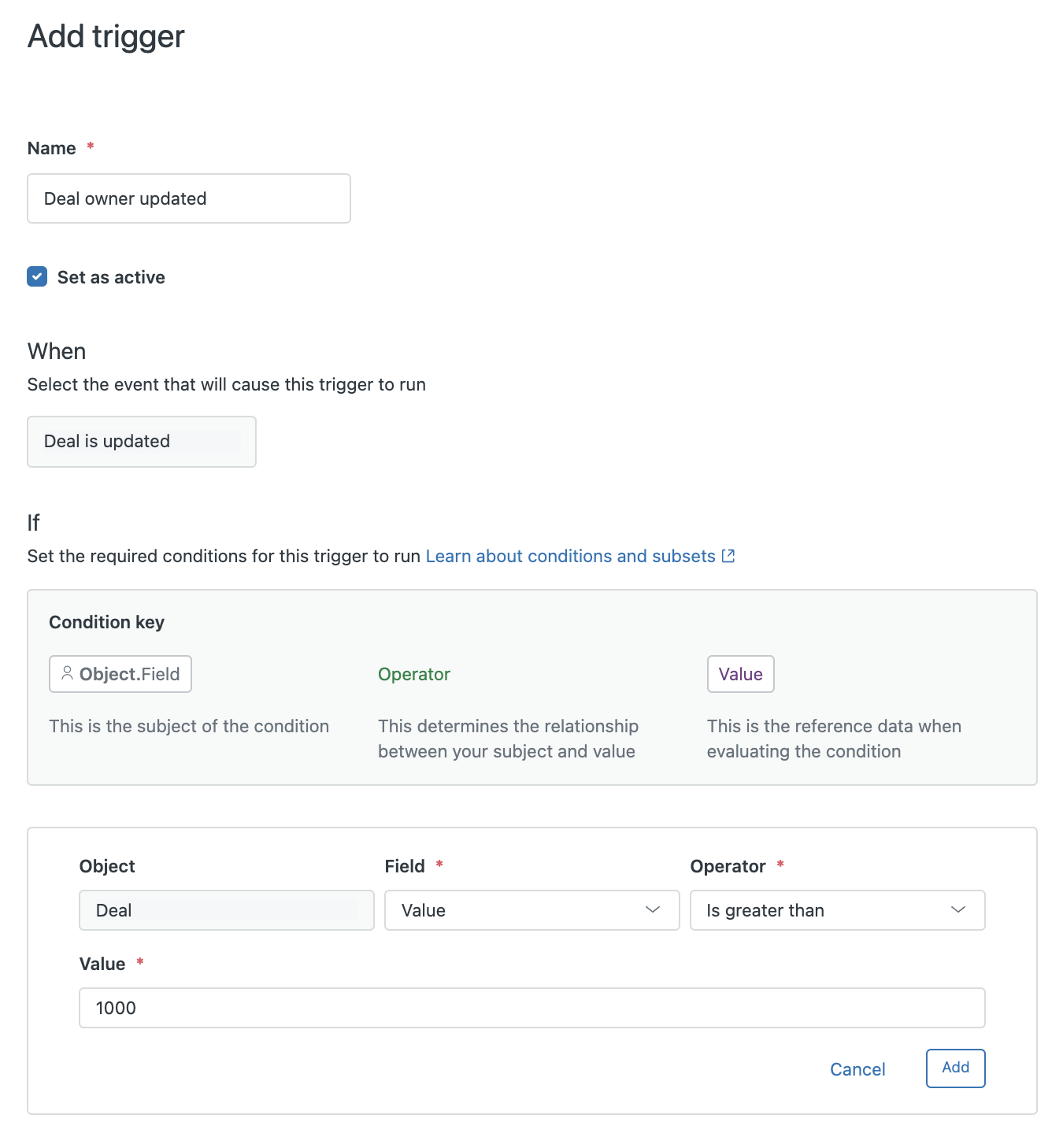 Deal owner updated). - Marque a caixa de seleção Definir como ativo se quiser que esse gatilho seja ativado.