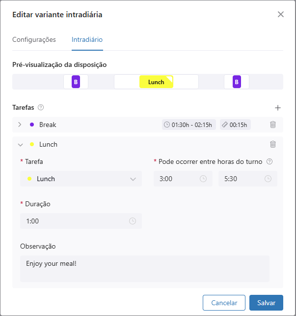 - Defina o intervalo de tempo em que a tarefa pode ser feita, contando a partir do início do turno e a duração da tarefa.